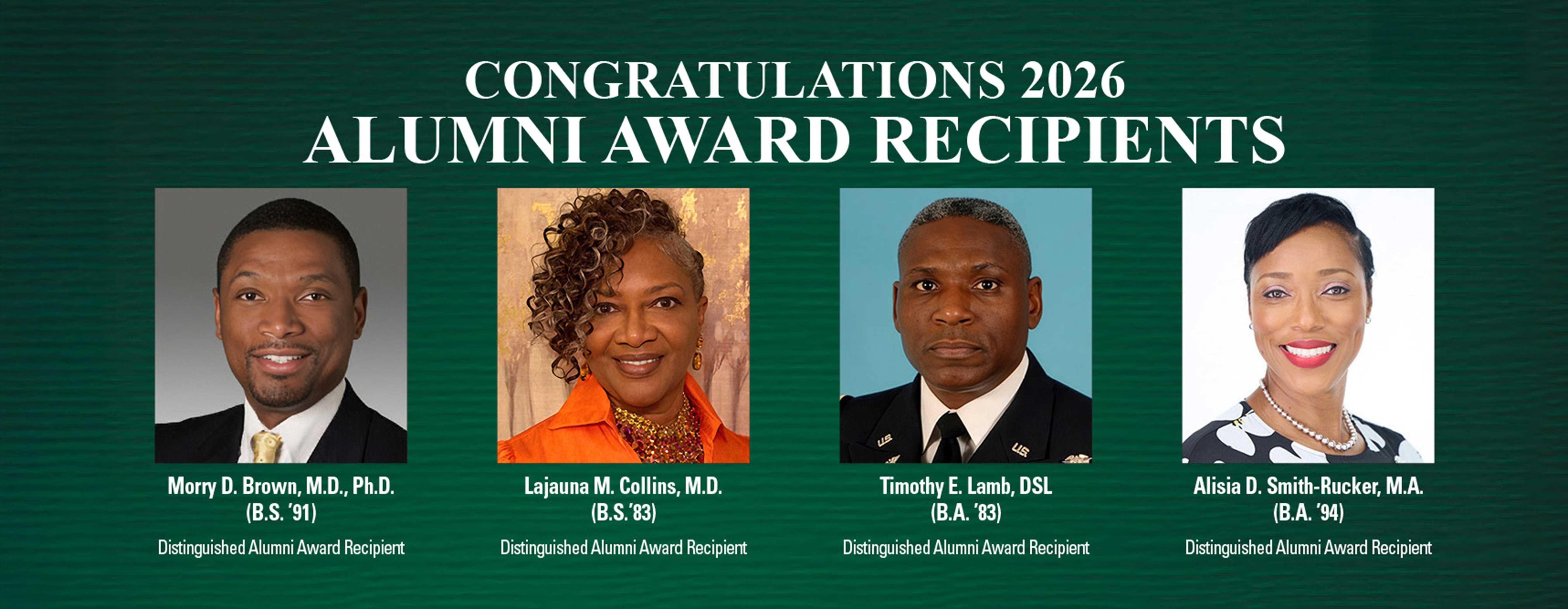 Norfolk State University will honor four of its alumni at the 2026 Alumni Awards Celebration scheduled for 7 p.m., Friday, May 8, at the Norfolk Waterside Marriott. Each of these graduates has demonstrated exemplary leadership and community service. They personify the mission and goals of the University. The 2026 Distinguished Alumni Award recipients are: