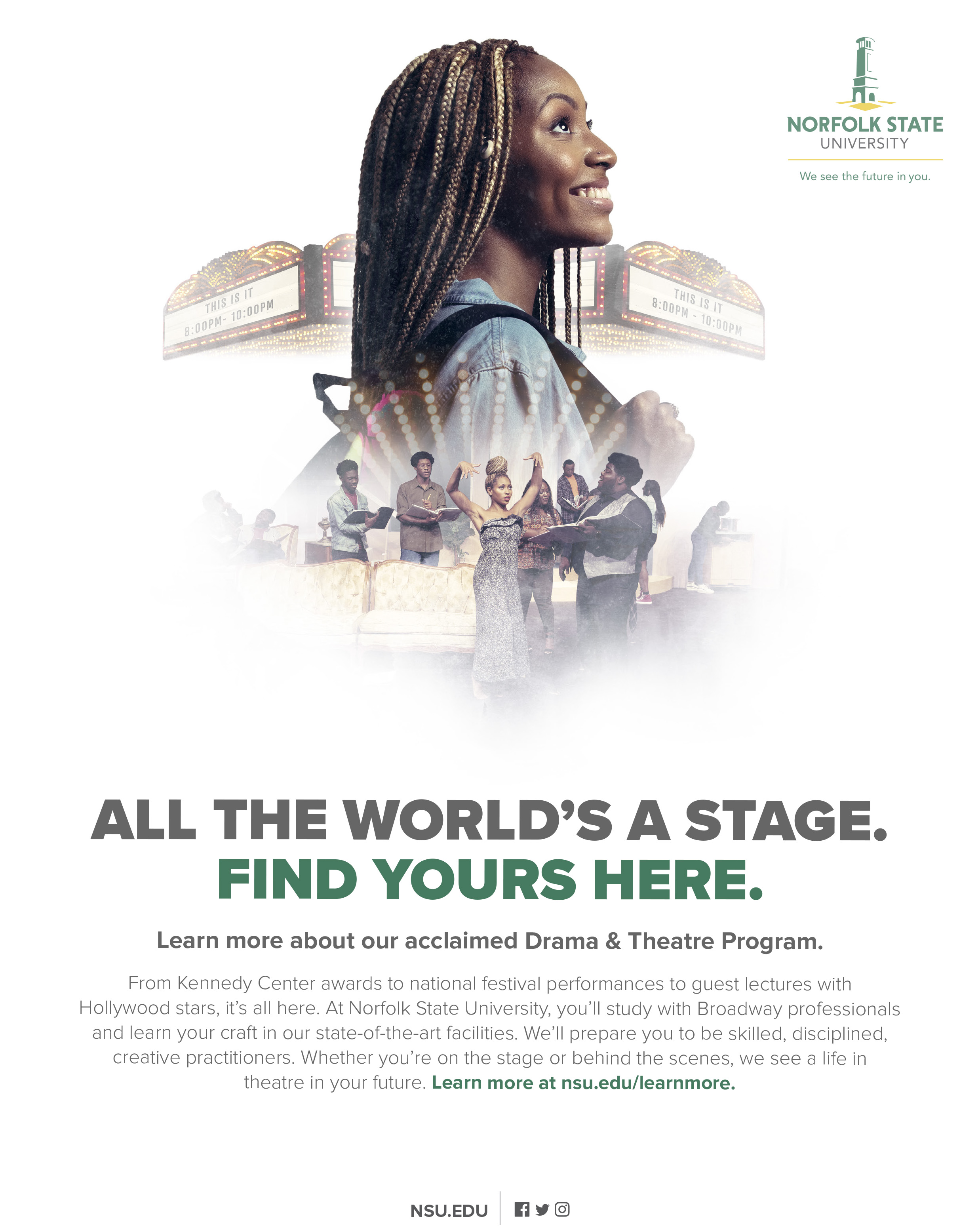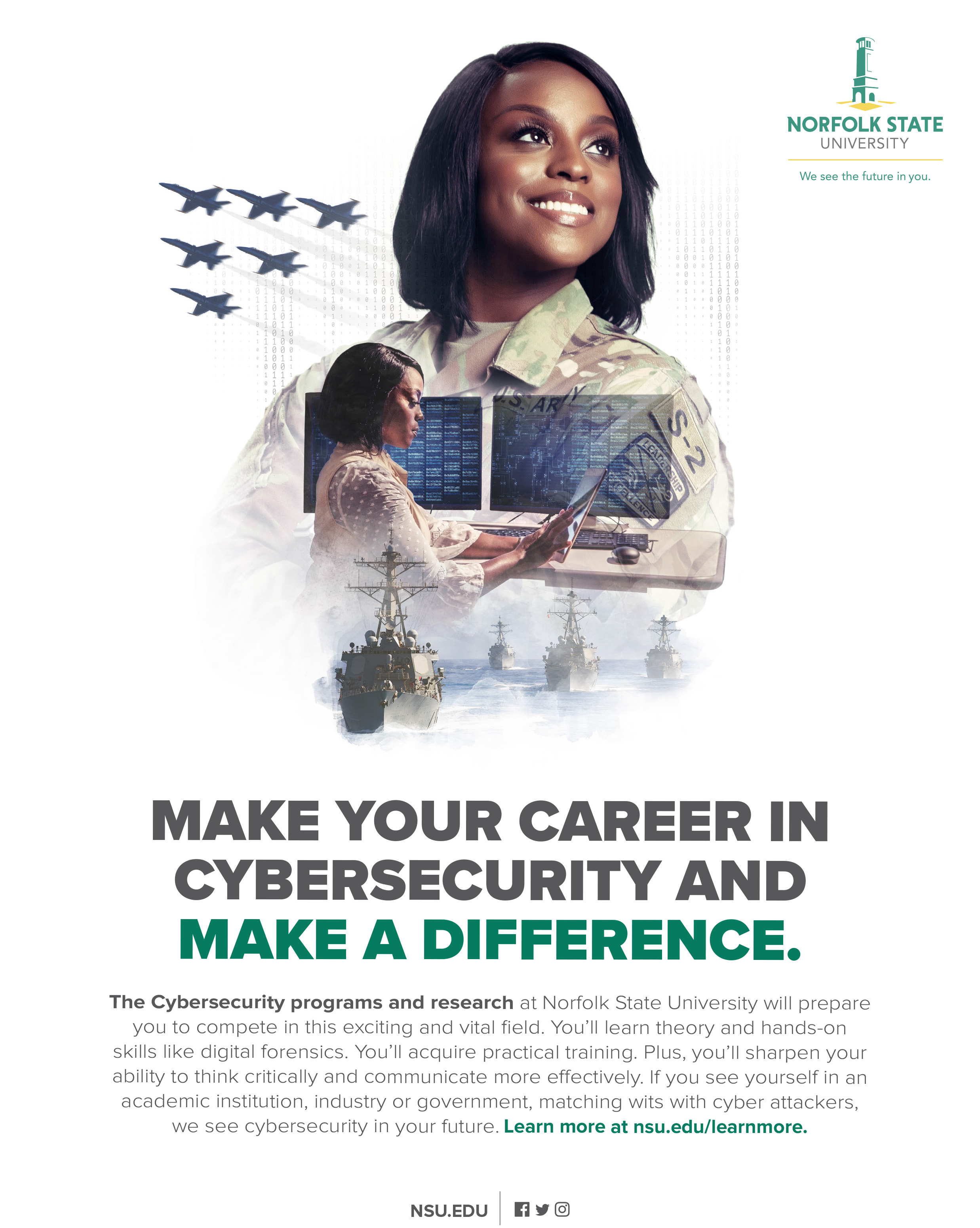 Through the use of creative visuals, the students are shown in both present day and future environments in these uplifting and inspiring ads that seek to bring awareness to the outstanding academics at NSU and increase enrollment in the featured priority programs of Cybersecurity, Drama & Theatre, Nursing, Social Work and Business.